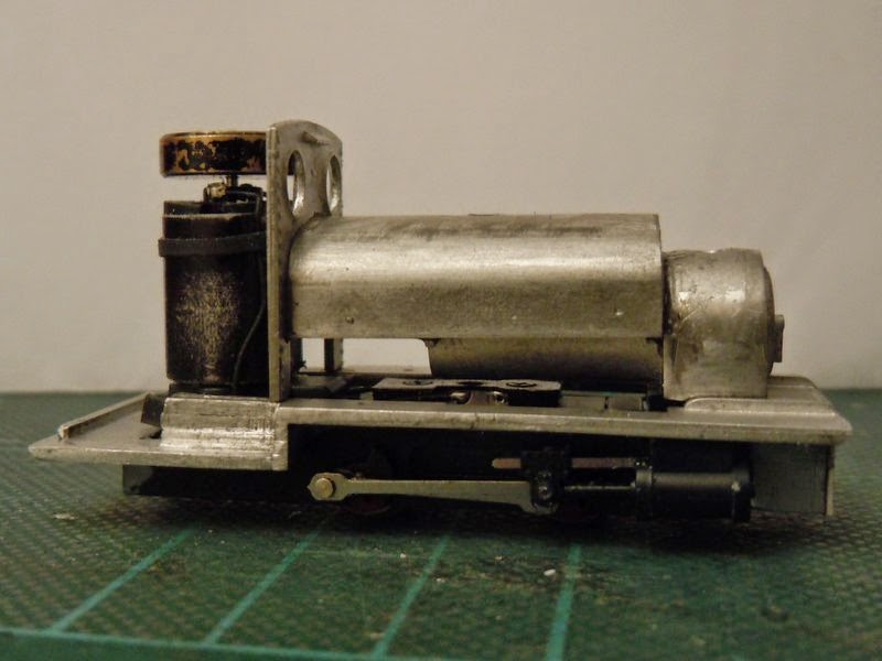However undeterred I got a new kit for the "Cackler / Jerry M" Hunslet (by Five79) and set about adapting it to fit the chassis! The dummy run trial below shows the smokebox set further back to line up with the cylinders (well nearly), and the saddle-tank scored with a line 4mm from the rear where it will be shortened. I'd already carefully removed the filler cap from the casting, which can hopefully be re-used, and the other round plate on top of the tank (purpose unknown!) was filed smooth. The footplate has the hole for the motor opened out towards the rear a little.
